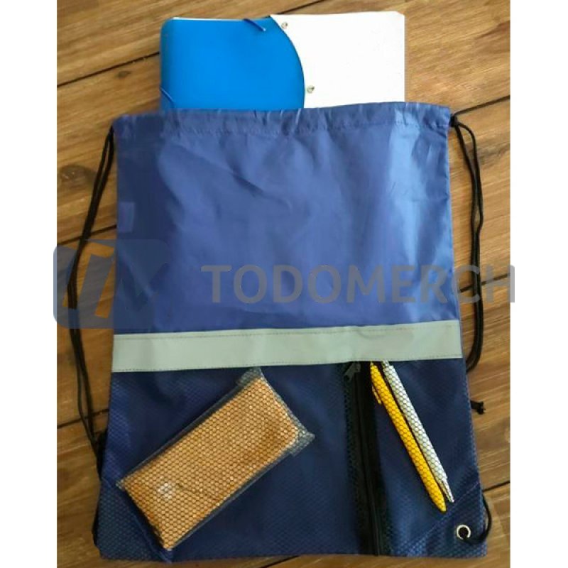 Bolso mochila con franja reflectante y bolsillo.