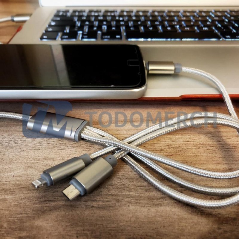Multi Puerto USB Cable cargador 3 en 1 metálico. Material del cuerpo del cable está cubierta por nylon trenzado. Largo: 1.20 mts.