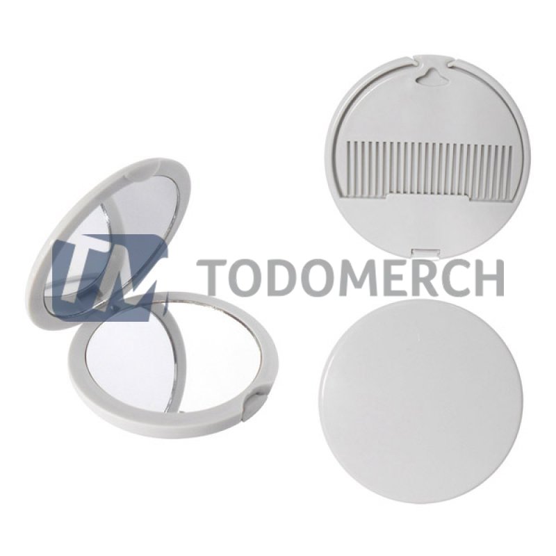 Medidas: 7 cm. Espesor: 1 cm. Descripcion: Espejo de cartera plástico, que contiene: 1 espejo normal y 1 espejo de aumento + 1 peine.