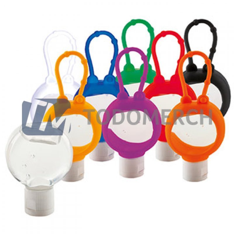 Medidas: Alto: 7cm Ancho: 5,2cm Espesor: 2,3cm (Aprox.). Descripcion: Frasco de gel, con sujetador de silicona de diferentes colores para llevarlo colgado y tenerlo accesible. Capacidad: 40 ml.