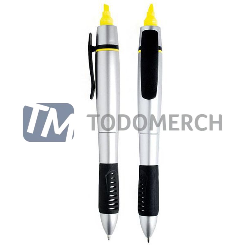 Medidas: Largo: 15 cm. Diámetro: 1.5 cm. (Aprox.) Descripcion: Lapicero plástico de sistema giratorio, de color plateado mate, con goma antidezlizante en la base y clip color negro. Resaltador en el extremo superior. Color de resaltador: Amarillo.