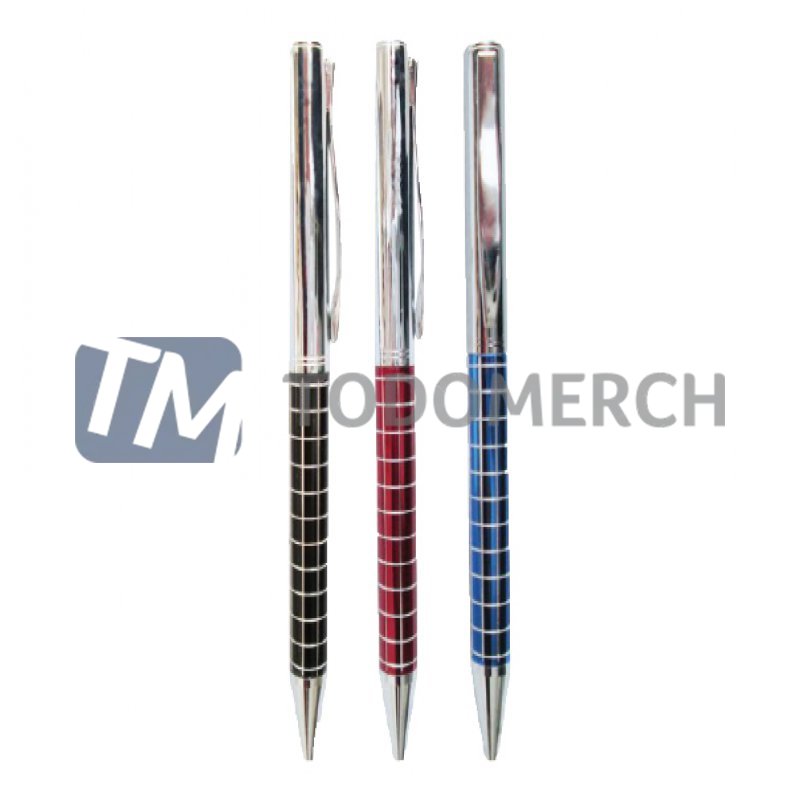 Medidas: Largo: 13.5 cm. Diámetro: 1.1 cm. (Aprox.) Descripcion: Lapicero metálico de sistema giratorio. Color de tinta: Seca color negro.