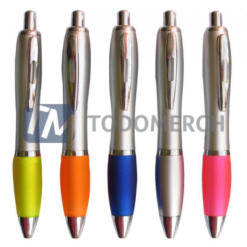 Medidas: Largo: 14 cm. Diámetro: 1 cm. (Aprox.) Descripcion: Lapicero plástico retráctil de color plateado mate, con goma antidezlizante de color traslíºcido.