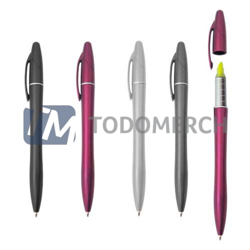 Medidas: Largo: 14,5 cm. Diámetro: 1.2 cm. (Aprox.) Descripcion: Lapicero plástico de sistema giratorio. Resaltador en el extremo superior. Color de resaltador: Amarillo.