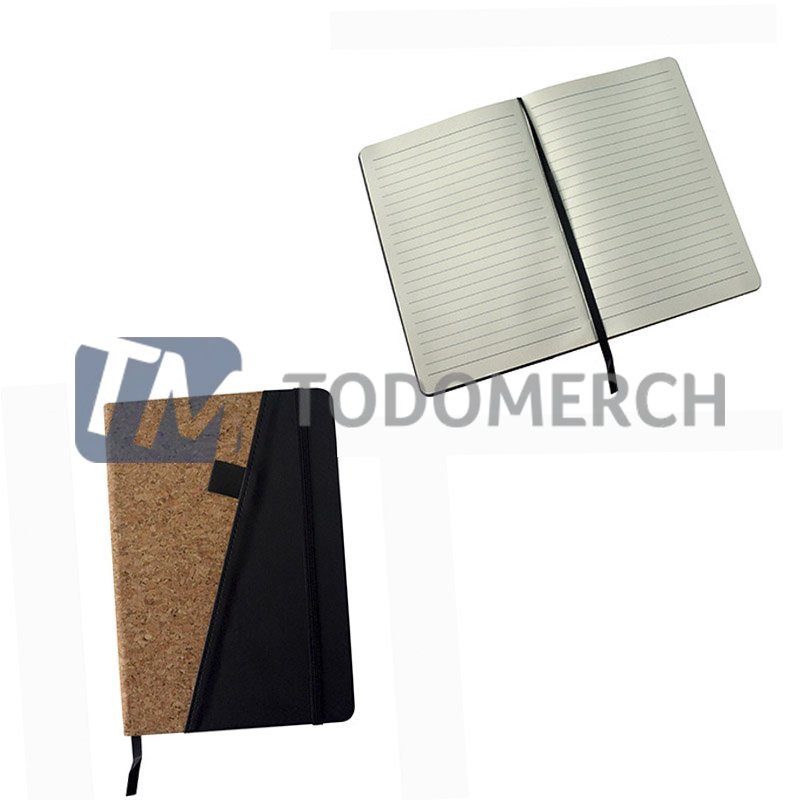 Descripción: Libreta A5 corcho con Biocuero de color negro, incluye viñeta porta lápicero.Contiene 80 hojas de color crema(rayadas), incluye liga de color negro.