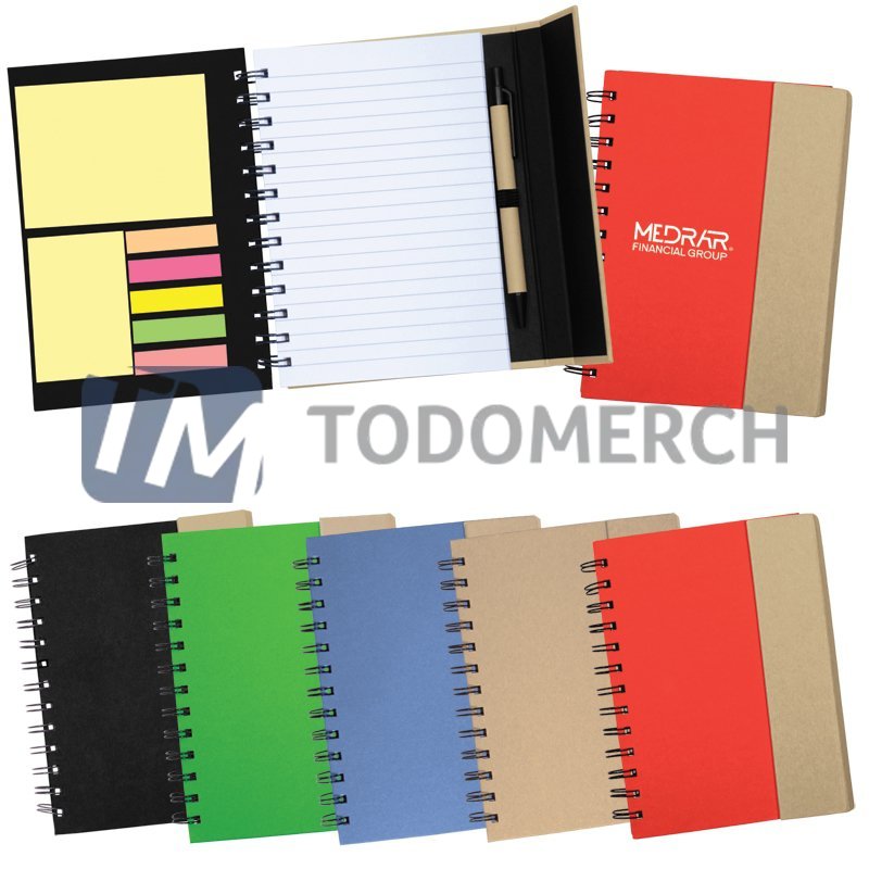 Descripcion: Libreta anillada de aprox. 70 hojas blancas rayadas, 25 hojas de notas adhesivas y banderas, bolígrafo ecologico.