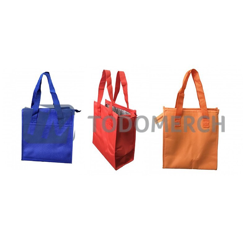Material: Notex 140 grms Interior: Aluminio PET Accesorios: Cierre / Bolsillo 1 lado / Asas Medida Bolsa: 24.5cm ancho x 27cm alto x 13cm fuelle