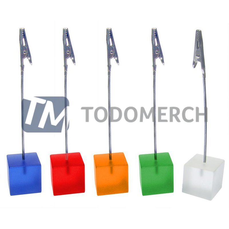 Medidas: Alt de base : 2.5 cm Ancho : 2.5 cm Alt total : 12.5 cm. Aprox. Descripcion:Artículo de base acrílica de colores, en forma de cubo; con clip sujetador de metal para los memos.