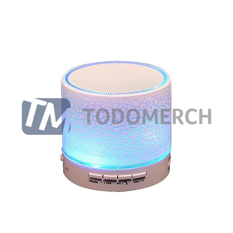 Mini Bluetooth Speaker con juego de luces led durante el funcionamiento. Material: plástico. Contiene entrada Micro SD, USB y radio FM. Incluye cable de carga DIAMETRO: 5.6 cm. Aprox. Altura: 5.3 cm. aprox