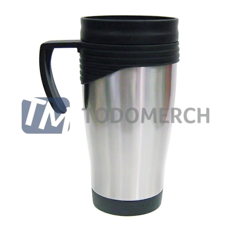 Medidas: Alto: 17 cm. Diámetro: 8 cm. (Aprox.) Capacidad: 450 ml. Aprox. Descripcion: Interior totalmente plástico en color negro, por fuera cuerpo de metal en color plateado, el borde del jarro, el mango (asa) y la base son de plástico color negro.