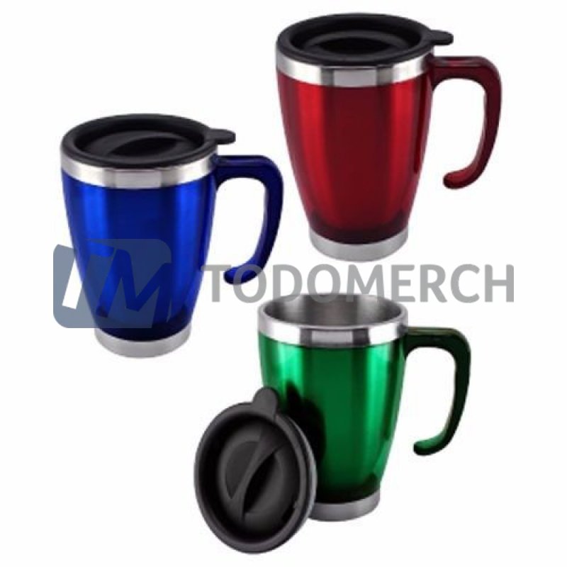 Descripcion: Tomatodo metálico (interior y exterior) con recubrimiento de acrílico trasclíºcido en el medio del cuerpo del jarro, de los diferentes colores (Ver colores), la tapa y asa son de plástico negro.