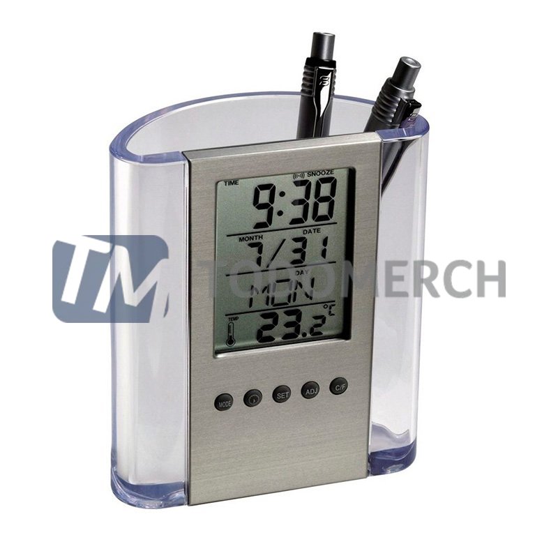 Medidas: Ancho: 9.5 cm. / Alto: 11.5 cm. / Largo: 5 cm. (Aprox.) Descripcion:Portalapicero de plástico transparente, con reloj en la parte frontal.