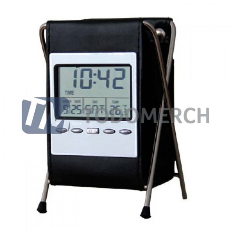 Medidas: Ancho: 10 cm. / Alto: 14 cm. / Largo: 9 cm. (Aprox.) Descripcion: Portalapicero con cuerina y soporte de metal, con reloj en la parte frontal.