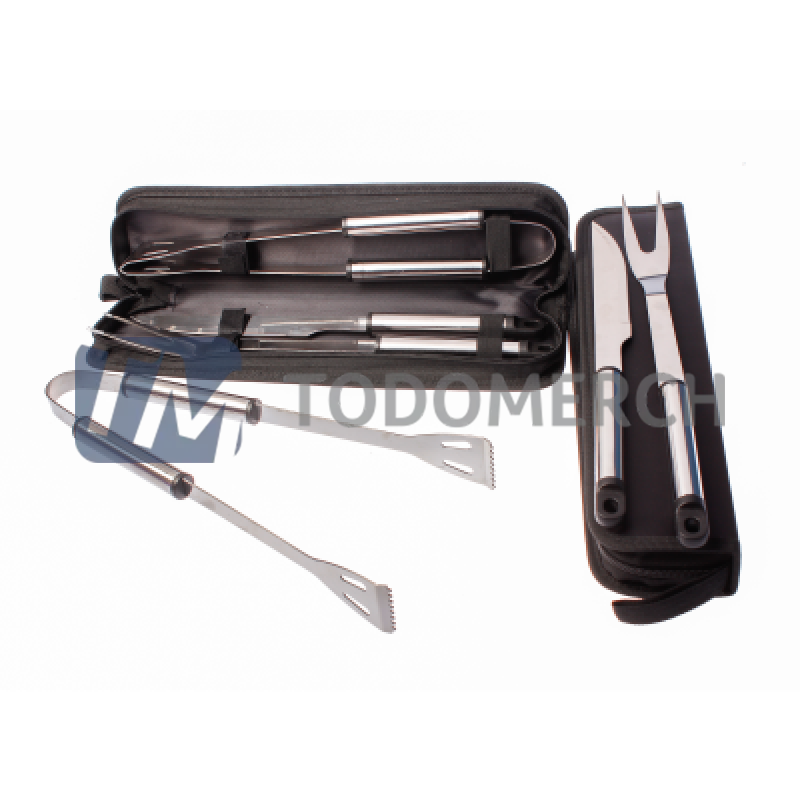 Set parrillero que contiene una pinza, un cuchillo, un trunche más estuche Medidas: 39 x 11 x 3.5 cm