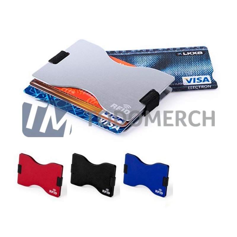 TARJETERO RFID Tarjetero con tecnología de seguridad RFID (Identificación por Radio Frecuencia) que mantiene seguros los datos de las tarjetas. Resistente cuerpo doble de acabado en aluminio brillante con sistema de fijación mediante bandas elásticas y diseñado para almacenar varias tarjetas. Presentado en bolsita individual de diseño. Aluminio Protector RFID. 1 Compartimento. Especificaciones Artículo 8,9 cm / 5,8 cm / 0,7 cm | 29 gr