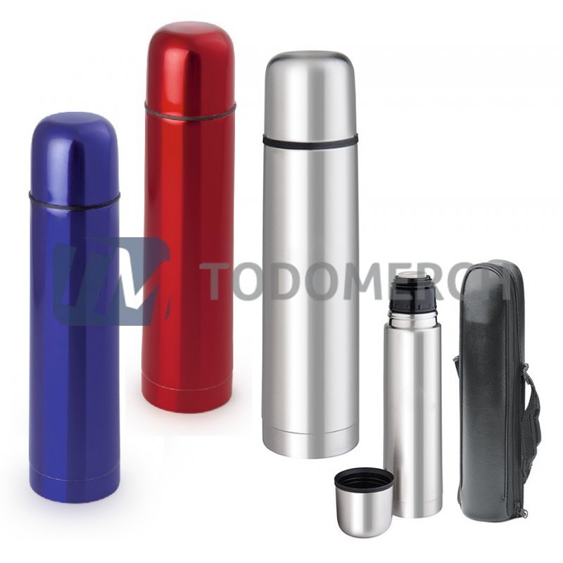 Medidas: Alto: 23 cm. Diámetro: 7 cm. (Aprox.) Descripcion: Termo metálico de 1/2 litro Aprox. de capacidad, con funda negra para llevar.